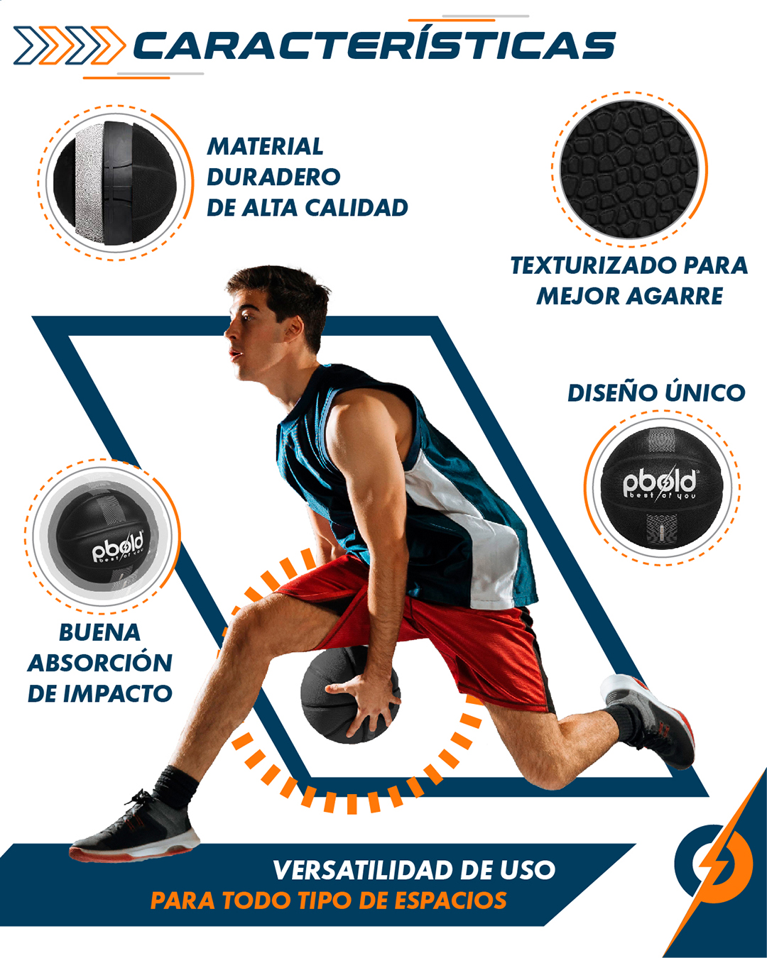 Su superficie texturizada antideslizante mejora el control del balón en cada pase, bote y lanzamiento, mientras que su construcción reforzada soporta el uso constante en concreto, asfalto o madera sin deformarse.