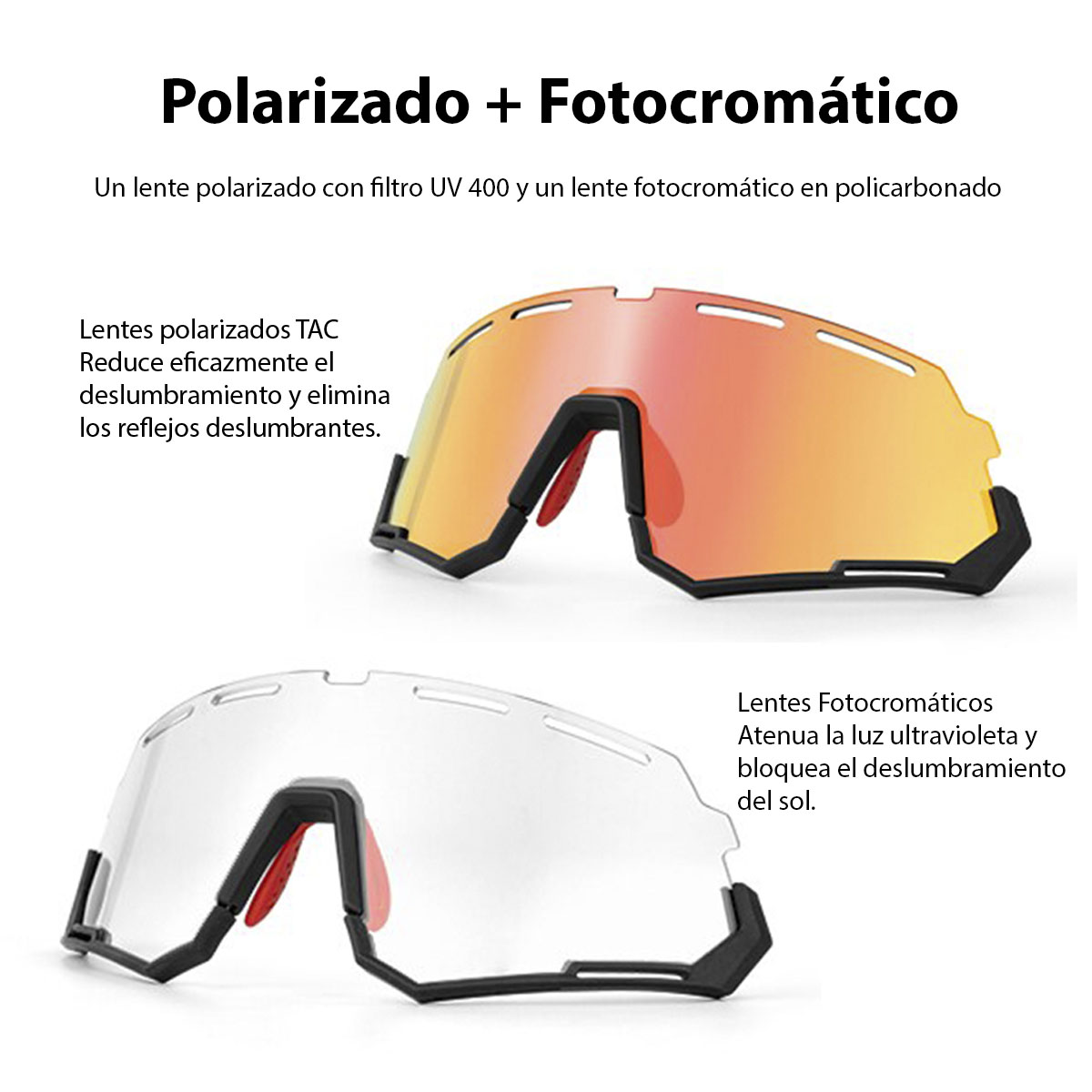 🚴 Polarizado Antirreflejo – Reduce brillo de asfalto, agua y vehículos